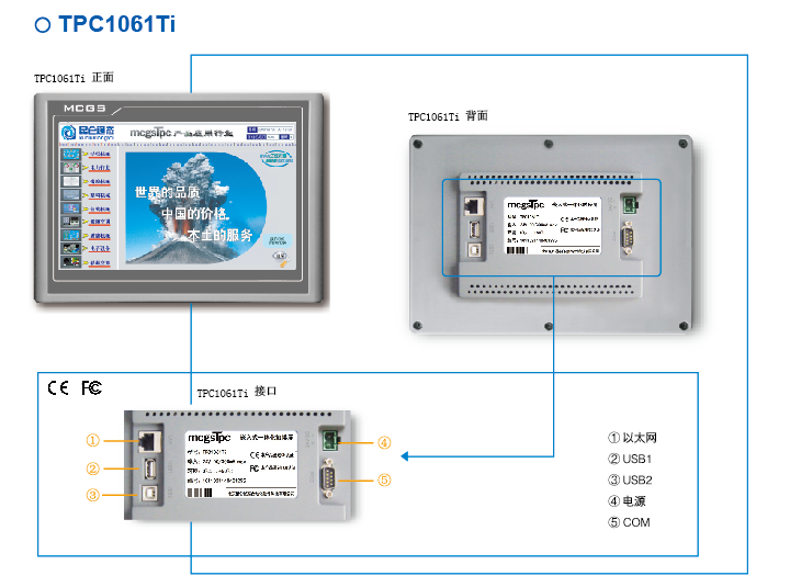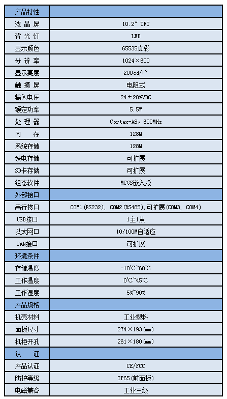 TPC1061Ti,是一套以先進的Cortex-A8 CPU為核心(主頻600MHz)的高性能嵌入式一體化觸摸屏。該產品設計采用了10.2英寸高亮度TFT液晶顯示屏(分辨率1024×600),四線電阻式觸摸屏(分辨率4096×4096)。同時還預裝了MCGS嵌入式組態軟件(運行版),具備強大的圖像顯示和數據處理功能。