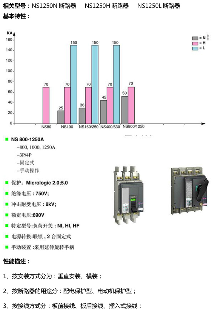 塑殼斷路器NS系列塑殼式斷路器。其設(shè)計體現(xiàn)了限流原理和制造技術(shù),是有結(jié)構(gòu)好、全模塊化等特點。適用于交流690V,頻率50-60Hz,額定電流12.5A~1600A的電力線路中短路和過載保護之用。額定絕緣電壓達690V在正常情況下作不頻繁的閉合或斷開之用,也可作鼠籠式電動機的不頻繁起動,運轉(zhuǎn)中中斷、過載以及在電動機,短路及欠電壓時起保護之用。